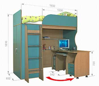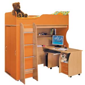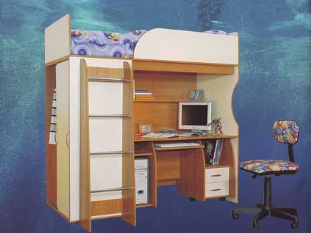 Самый компактный детский комплекс длиной всего 180 см. Состоит из кровати, шкафа и выкатного компьютерного стола. Шкаф состоит из платяного отделения для верхней одежды и секции с полками. Выкатной компьютерный стол укомплектован подставкой под системный блок, выдвижной полкой для клавиатуры и выдвижными ящиками для бумаг. Кровать имеет боковые бортики. Лестница выполнена с надежными металлическими ступенями.