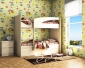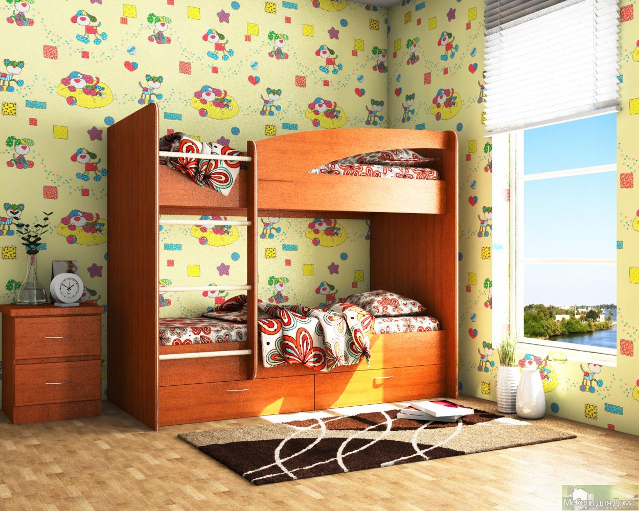 Комплект детской мебели, состоящий из кровати двухъярусной, выдвижных ящиков и шкафа корпус и фасады доступны в трех цветах: Вишня, Орех, Дуб млечный.