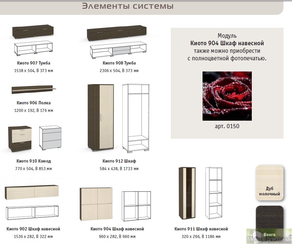 Модули и их стоимость:Киото 902 Шкаф навесной: Размер, мм: 1536×282, В 322 мм. Цена 3 670 руб.Киото 902 Шкаф навесной арт. к-01: Размер, мм: 1536×282, В 322 мм. Цена 4 190 руб.Киото 902 Шкаф навесной арт. к-02: Размер, мм: 1536×282, В 322 мм. Цена 4 190 руб.Киото 904 Шкаф навесной: Размер, мм: 960×282, В 960 мм. Цена 5 840 руб.Киото 904 Шкаф навесной арт. к-01: Размер, мм: 960×282, В 960 мм. Цена 6 620 руб.Киото 904 Шкаф навесной арт. к-02: Размер, мм: 960×282, В 960 мм. Цена 6 620руб.Киото 904 Шкаф навесной с фотопринтом: Размер, мм: 960×282, В 960 мм. Цена11 330 руб.Киото 906 Полка: Размер, мм: 1200×192, В 176 мм. Цена 590 руб.Киото 907 Тумба: Размер, мм: 1538×504, В 373 мм. Цена 4 740 руб.Киото 908 Тумба: Размер, мм: 2306×504, В 373 мм. Цена 7 680 руб.Киото 910 Комод: Размер, мм: 770×504, В 853 мм. Цена 5 580 руб.Киото 910 Комод арт. к-01: Размер, мм: 770×504, В 853 мм. Цена 6 140 руб.Киото 910 Комод арт. к-02: Размер, мм: 770×504, В 853 мм. Цена 6 140 руб.Киото 911 Шкаф навесной: Размер, мм: 320×266, В 1186 мм. Цена 2 330 руб.Киото 912 Шкаф: Размер, мм: 584×438, В 1733 мм. Цена 4 790 руб.Киото 912 Шкаф арт. к-01: Размер, мм: 584×438, В 1733 мм. Цена 5 570 руб.Киото 912 Шкаф арт. к-02: Размер, мм: 584×438, В 1733 мм. Цена 5 570 руб.