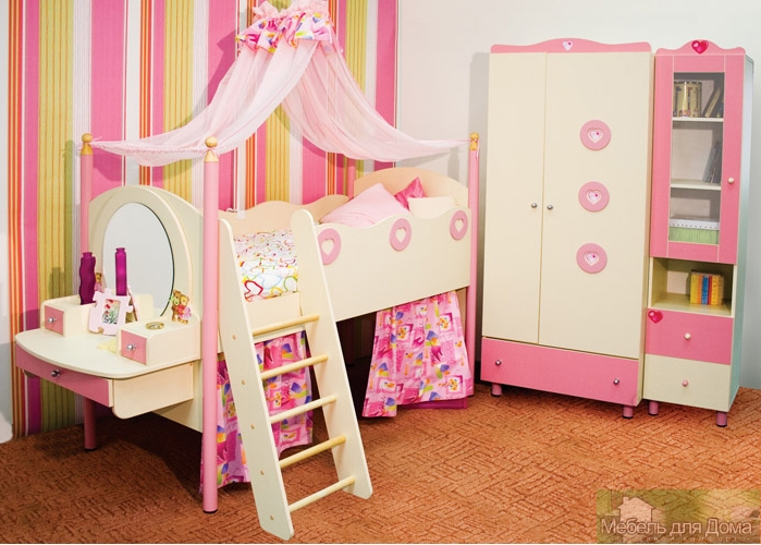 Что бы хотелось маленькой девочке? Быть принцессой. И белого пони. Можно. Эта детская мебель решена в нежно бежево-розовых тонах. С балдахином для сладких снов и туалетным столиком для наведения красоты. И прочими вместительными шкафами и стеллажами для девичьего гардероба.